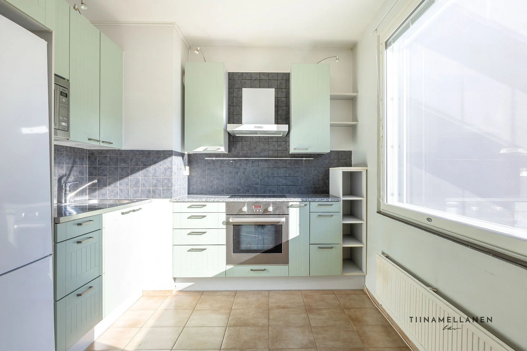 Keittiössä ja eteisessä on helppohoitoinen laattalattia lattialämmityksellä, joka tuo arkeen miellyttävää asumismukavuutta ympäri vuoden.