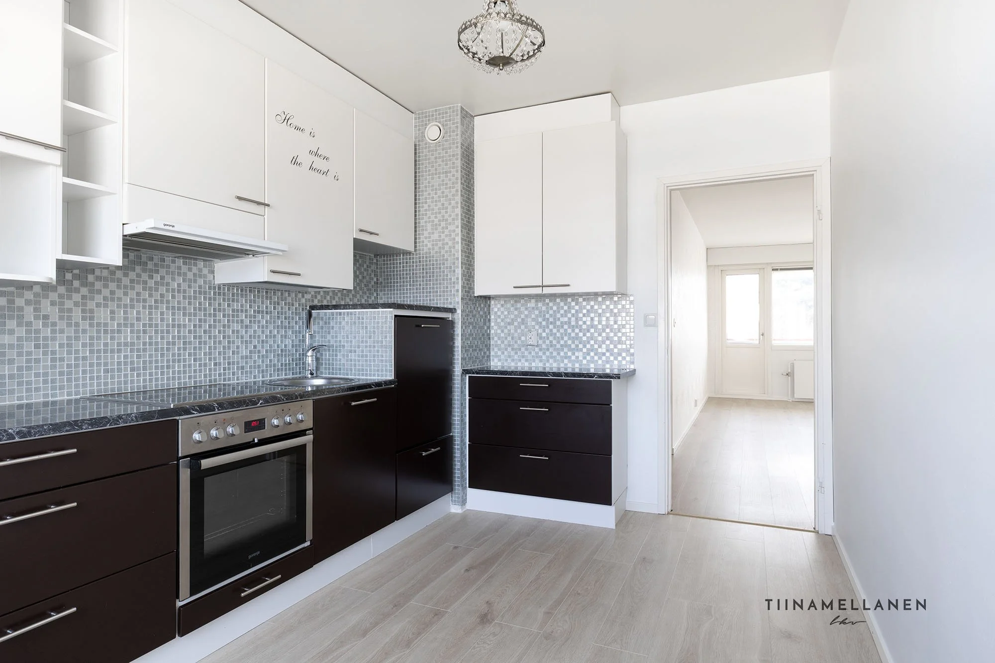 Keittiö sijoittuu luontevasti sisääntulon yhteyteen, mikä tekee arjesta sujuvaa kotiin saavuttaessa kauppakassien kanssa. Kompaktiin keittiöön mahtuu mukavasti pieni ruokapöytä, ja ruoanlaitolle jää silti hyvin tilaa. Keittiöstä on suora yhteys tilavaan olohuoneeseen, jonne suuret ikkunat päästävät runsaasti luonnonvaloa. Olohuoneeseen saa kalustettua sohvan lisäksi isomman ruokaryhmän, joten arki- ja juhlahetket onnistuvat kätevästi samassa tilassa. Olohuoneen jatkeena toimii lasitettu eteläparveke.